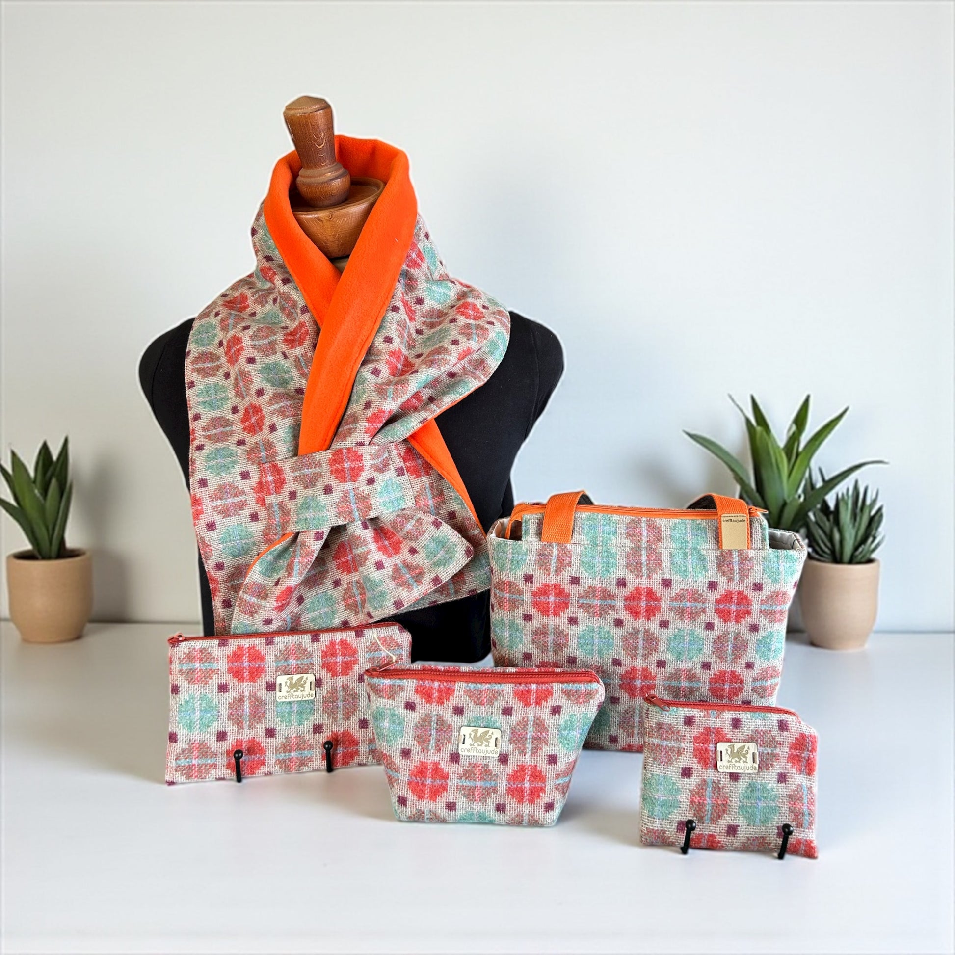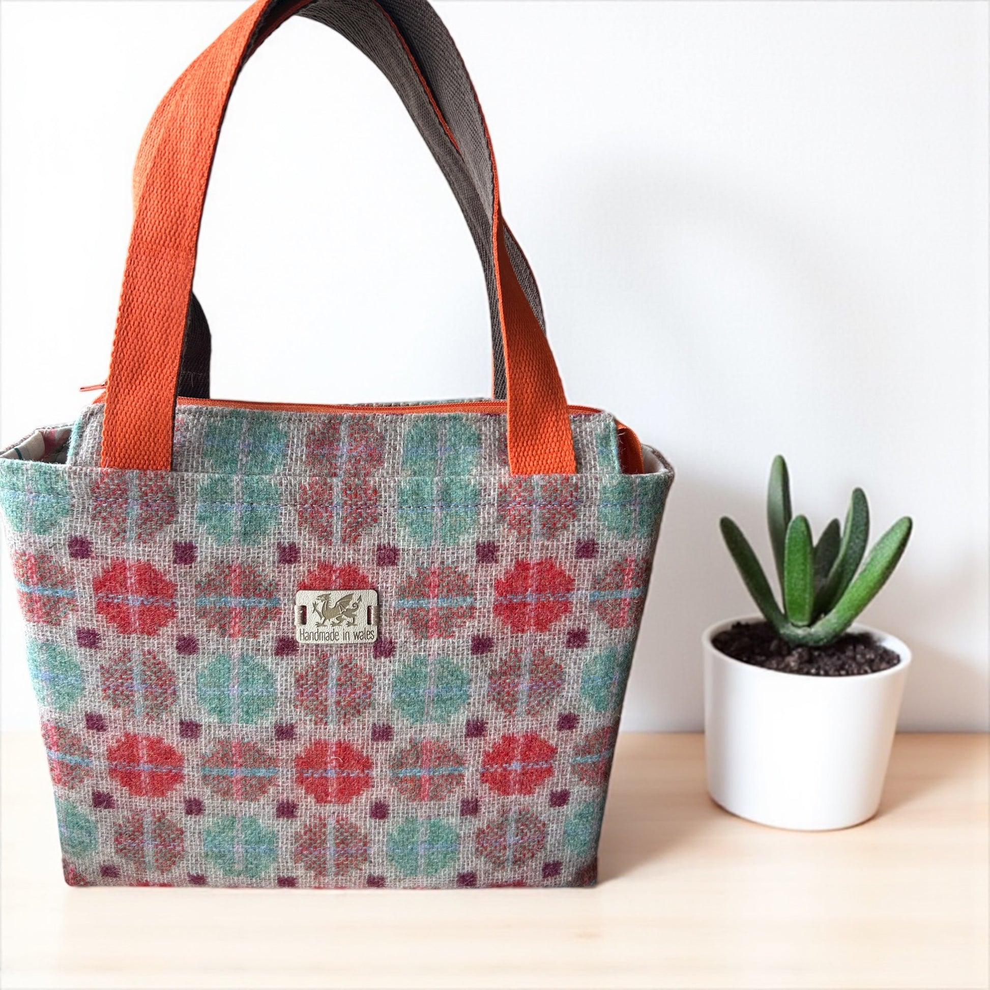 Small but perfectly formed Dyfi zip top handbag handcrafted from contemporary wool fabric, in a stunning geometric /circles design, in soft aqua, burnt orange and oatmeal . The pretty floral lining on a cotton sateen adds a feminine feel .