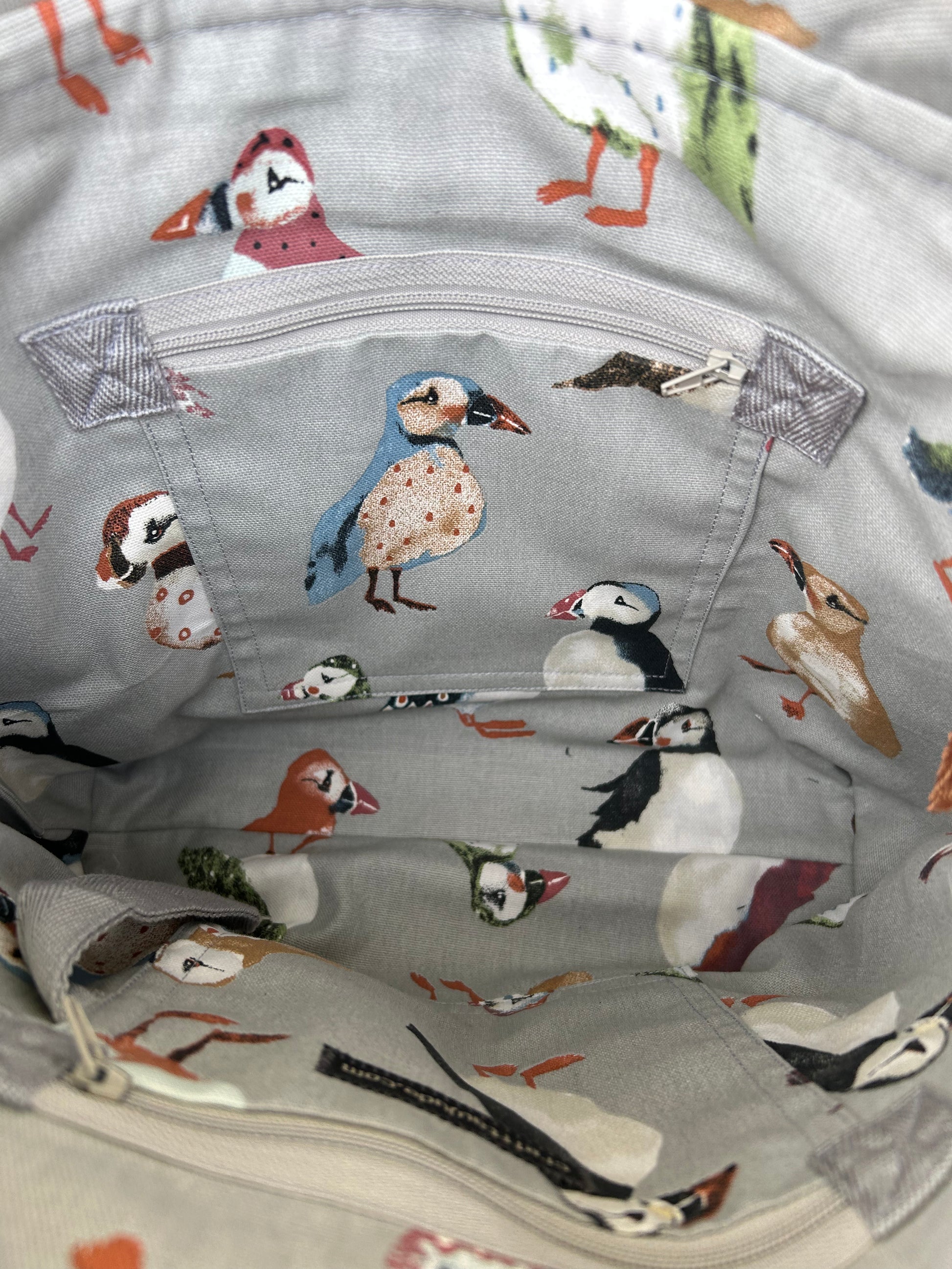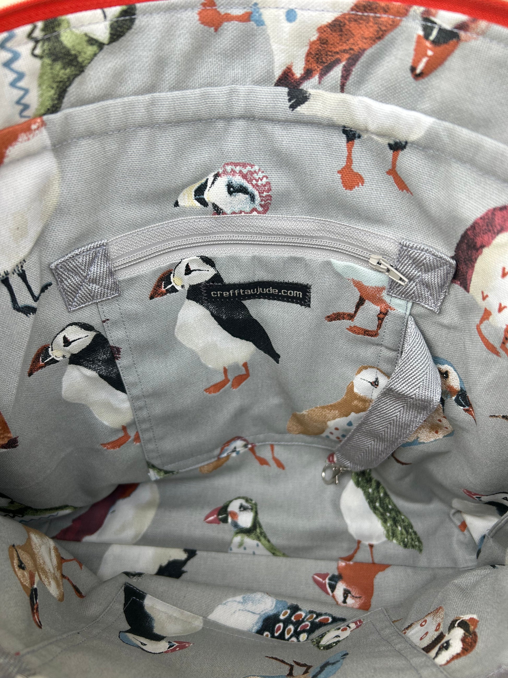 The inside features a colony of puffins on the printed cotton lining, and here you'll find two zip top pockets and a lobster key clasp to pop your keys onto, so they don't disappear at the bottom of the bag.