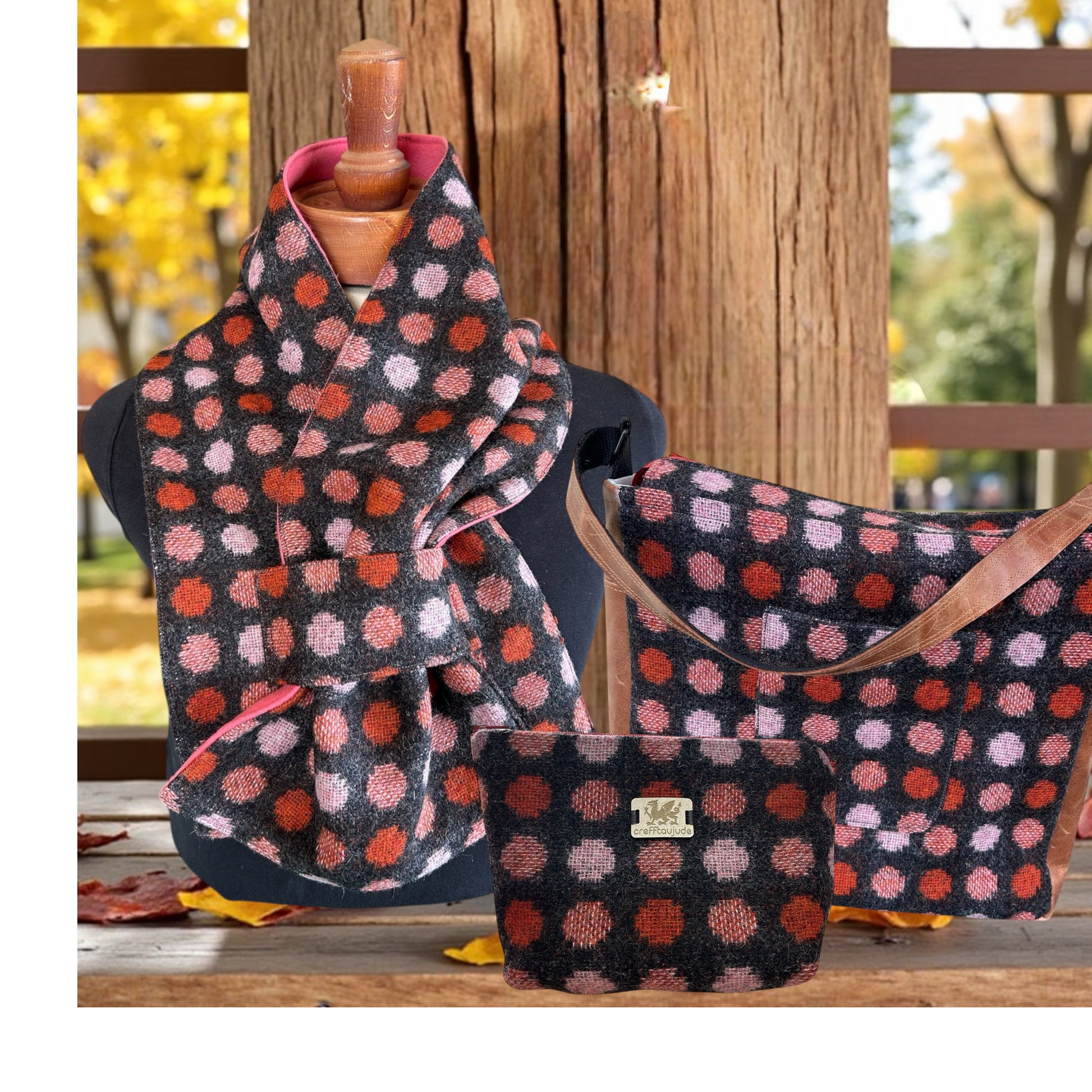 The Rheidol shoulder bag, seen here in a real tan leather combined with upcycled wool fabric. This truly lovely handbag has a real sense of style, from the tan leather side and base panels, to the wool fabric front and back , in this dark charcoal background, with burnt orange and pale pink circles, with a handy pocket on the outside front. (This was originally a pocket on the pinafore dress this lovely bag was made from. ,)