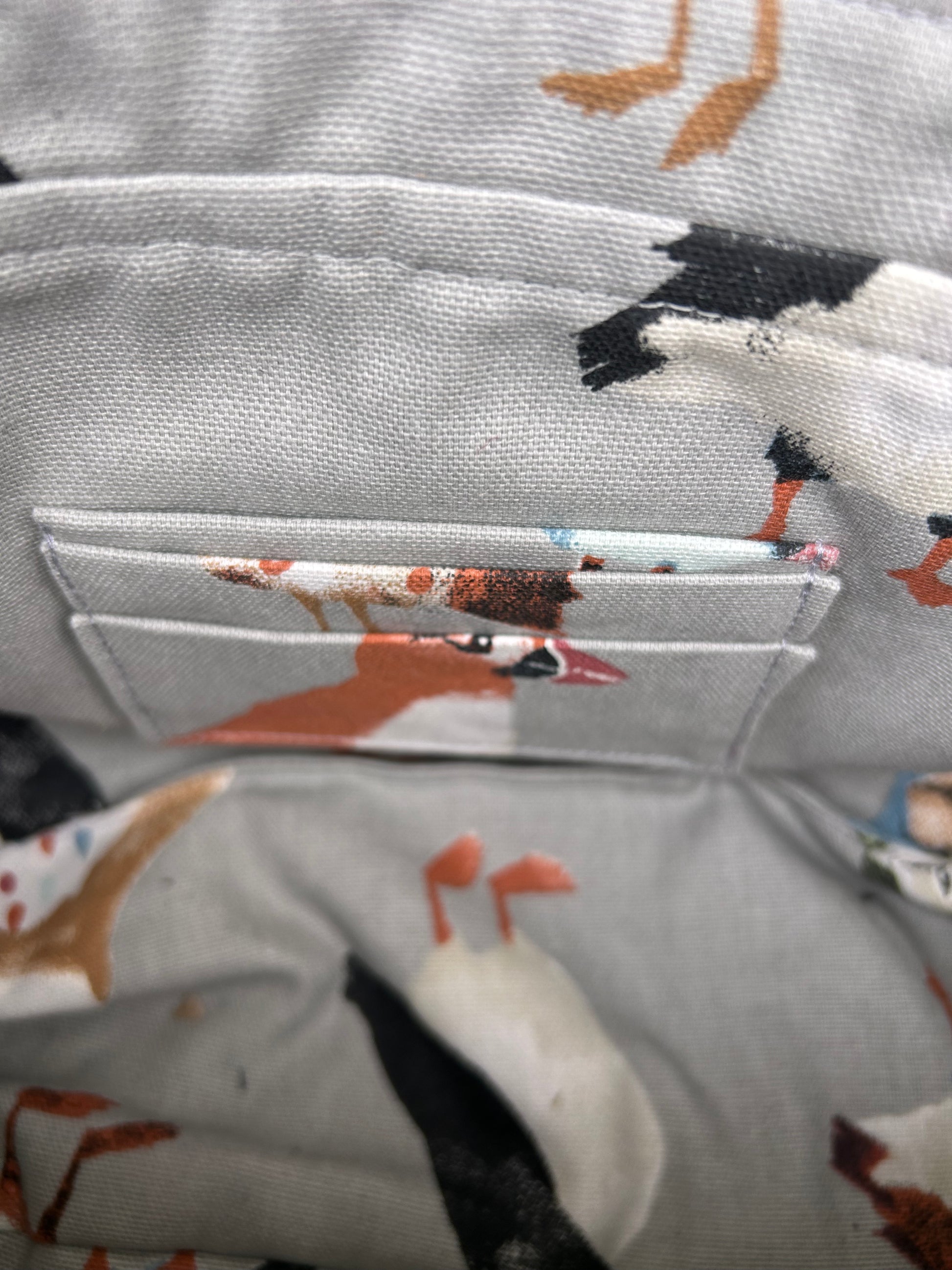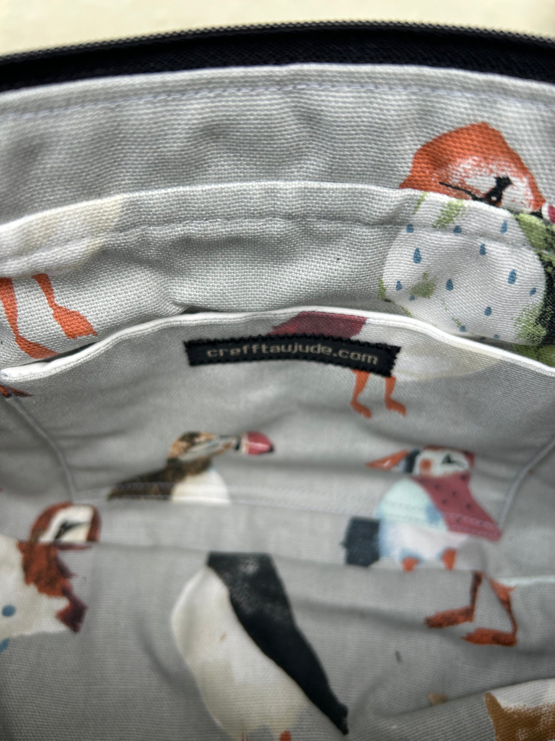 Fully lined with a cotton, puffin printed lining, and finished with a secure zip closure, this shoulder bag is the perfect size for everyday essentials. The lining has a small pocket, and on the other side a few credit card slots, even so, there is plenty of room for a purse, your phone, a few items of makeup and a few more bits and pieces.