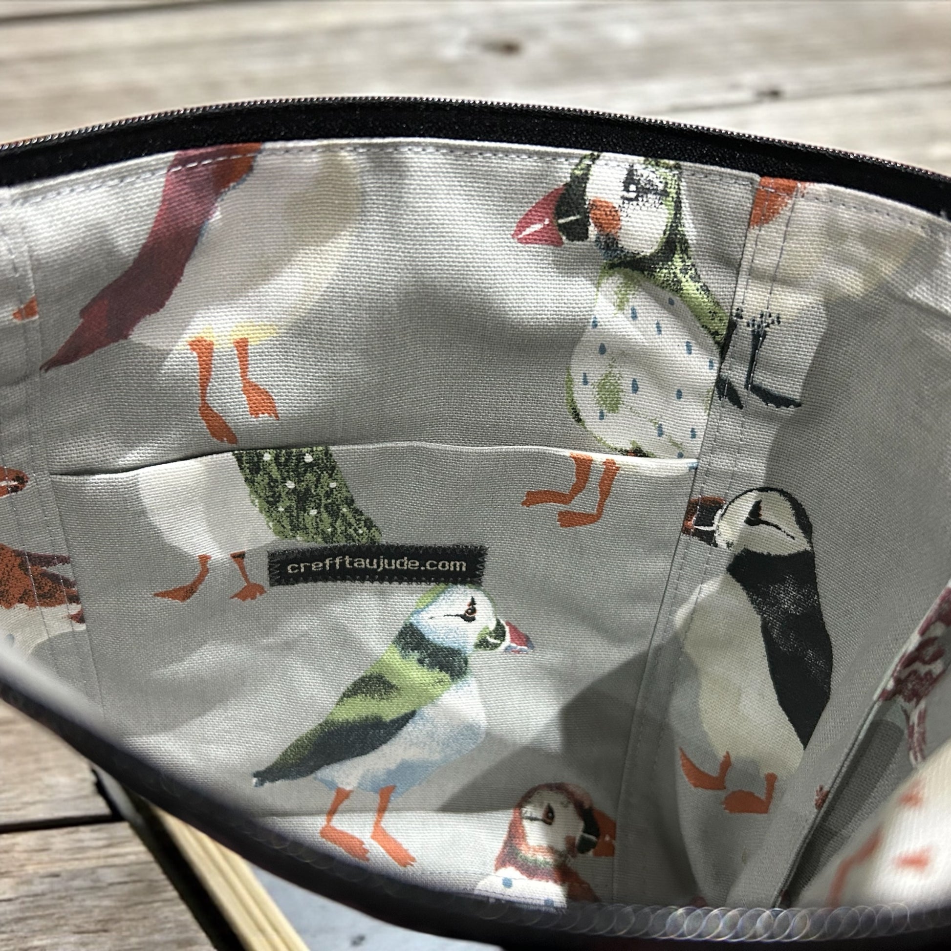 Inside you’ll find the signature quirky cotton printed lining …. This time puffins in different coordinating colours, with a phone sized pocket aswell .
