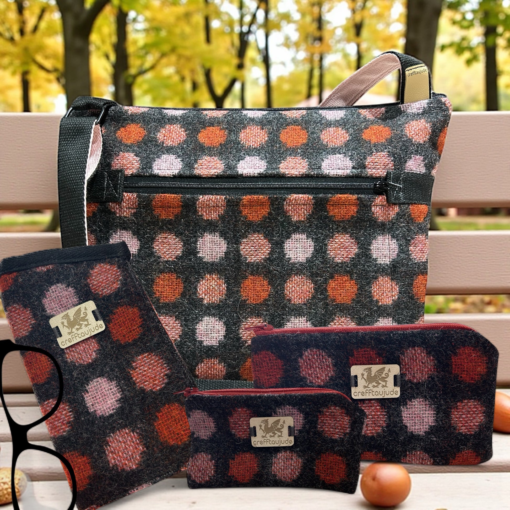 Add a touch of style to your everyday look with this gorgeous unique crossbody bag , handcrafted from upcycled wool fabric ( was previously a dress ) in warm shades of burnt orange & pale pink on a background of charcoal grey . The large polka dot design gives this piece a fun retro feel , while the practical shape makes it ideal for everyday use .