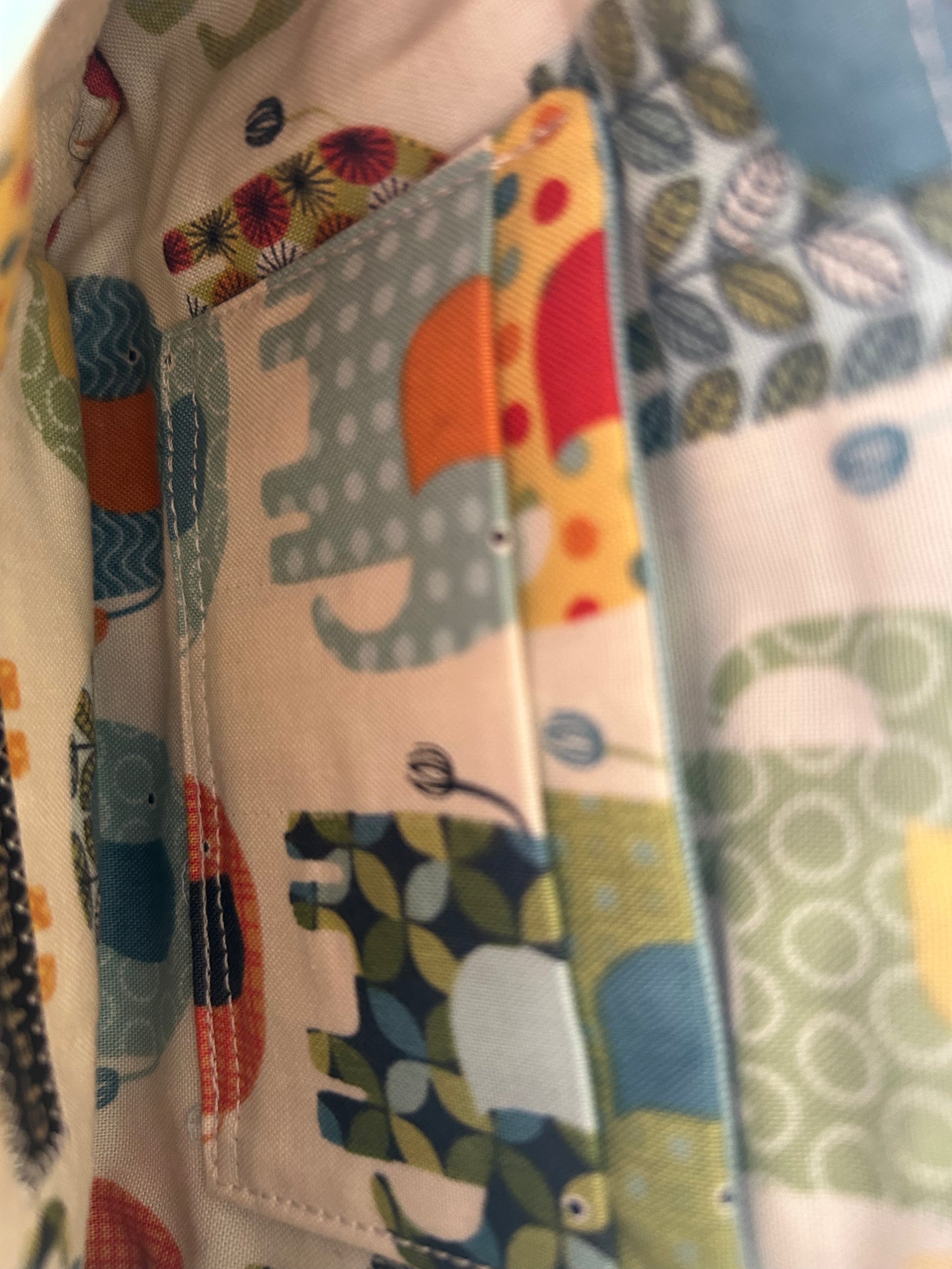 made from this beautiful aqua, burnt orange and oatmeal wool fabric in this contemporary designed fabric, with an elephant print cotton lining which has 2 credit card slots and a zipped pocket. So room for a phone, cash, cards, and a lipstick, it really could be a perfect wallet. Closes with a zip .