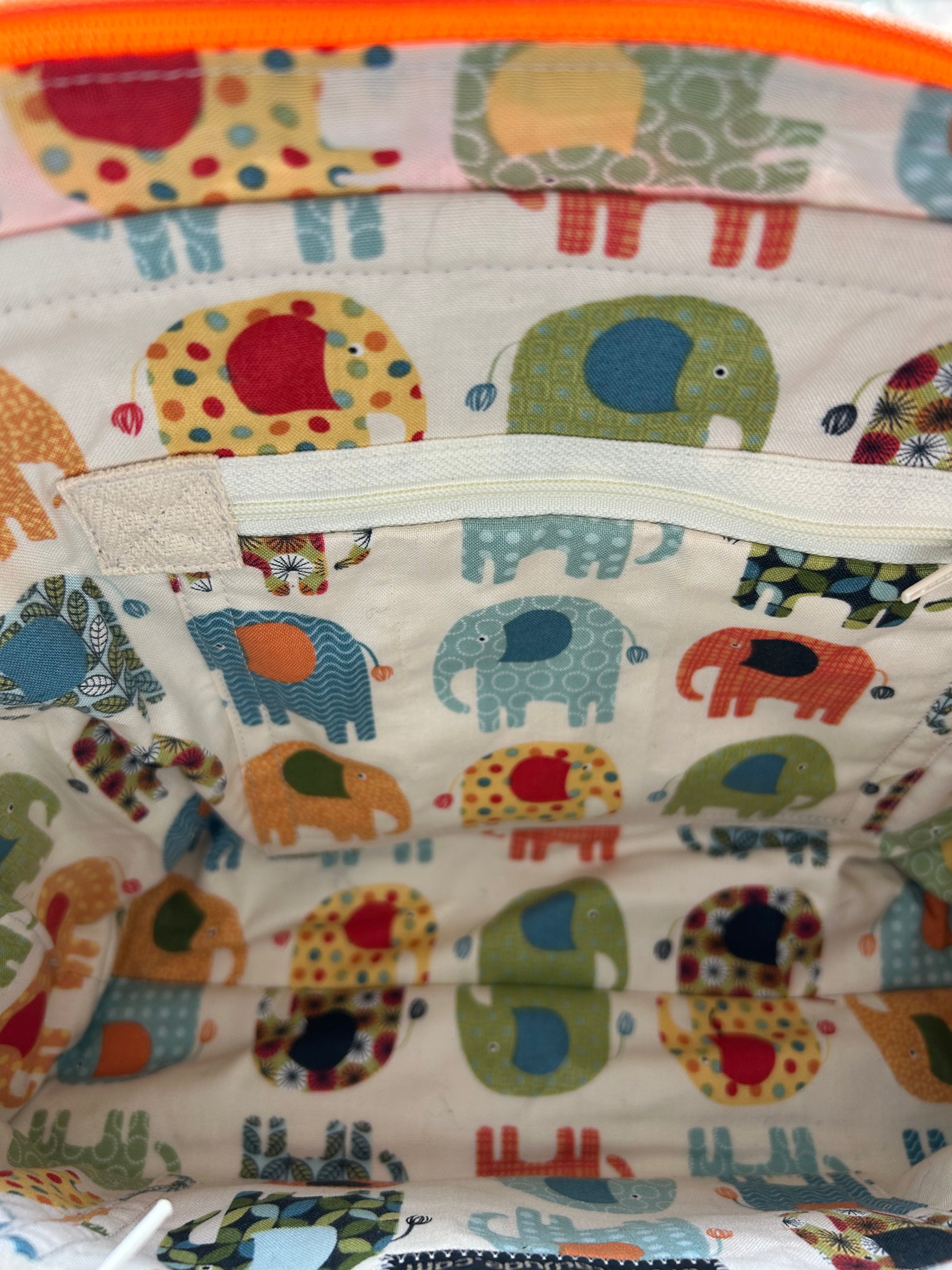 A beautifully handcrafted crossbody/shoulder bag made from a wool fabric and real leather. In a geometric/circles design in a lovely colour palette of soft aqua, burnt orange and oatmeal, combined with a rich buttery soft dark caramel colour leather. The leather side and base panel adds durability and style, with a two tone adjustable webbing strap and a zip top to close. Fully lined in a printed cotton ....just look at those cute elephants, guaranteed to make you smile every time you open the bag. Also with two zipped pockets on the inside for your bits and bobs.