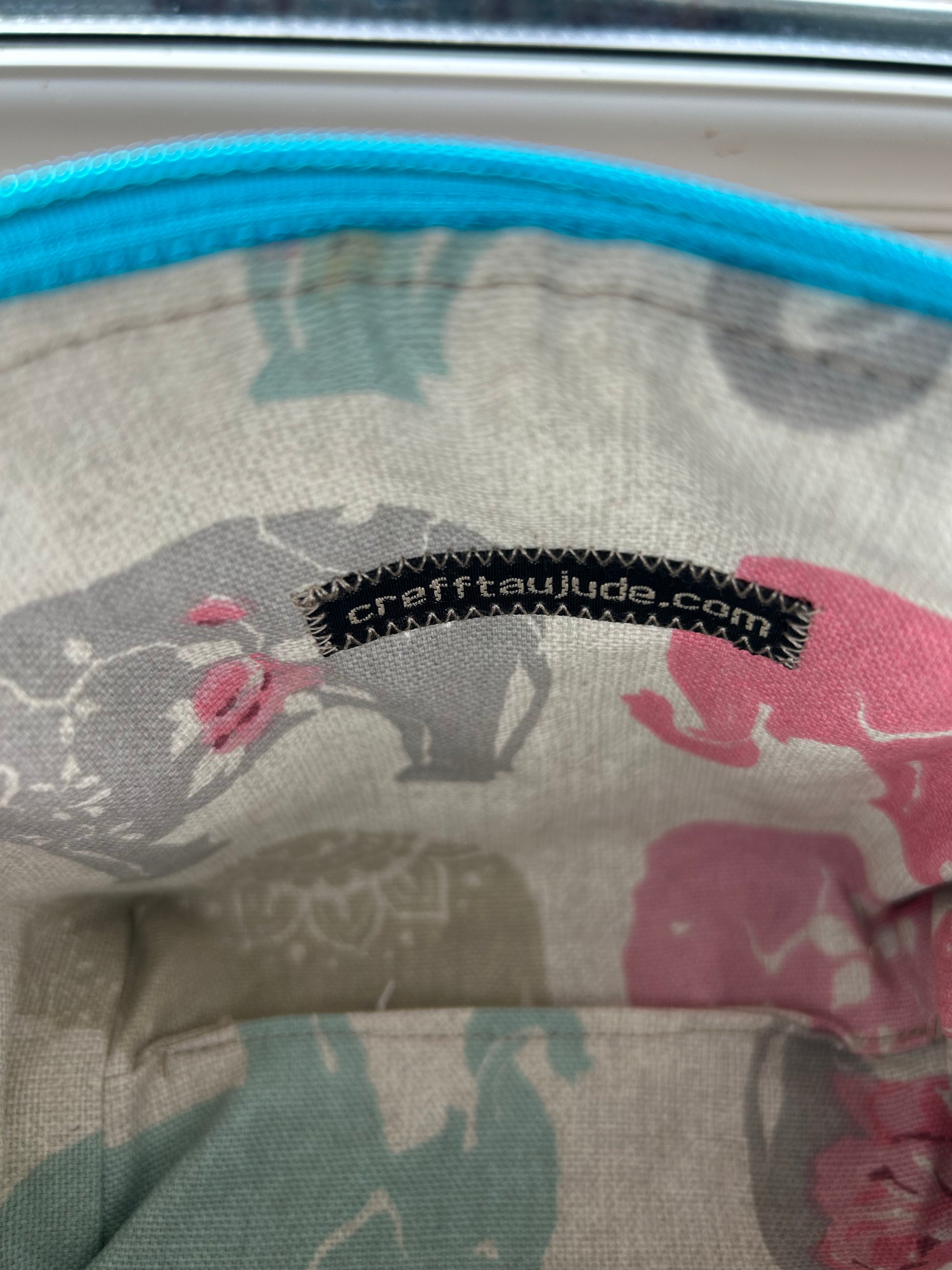 Upcycled wool mix geometric design fabric in turquoise, burgundy and cream , with a real leather panel in burgundy. Closes with a zip in bright turquoise, and on the inside a zipped pocket for either loose change or your keys, of a few credit cards. Big enough for a mobile phone so if you don't need to carry much , could be a handy small clutch, or a small make-up bag. You decide :)