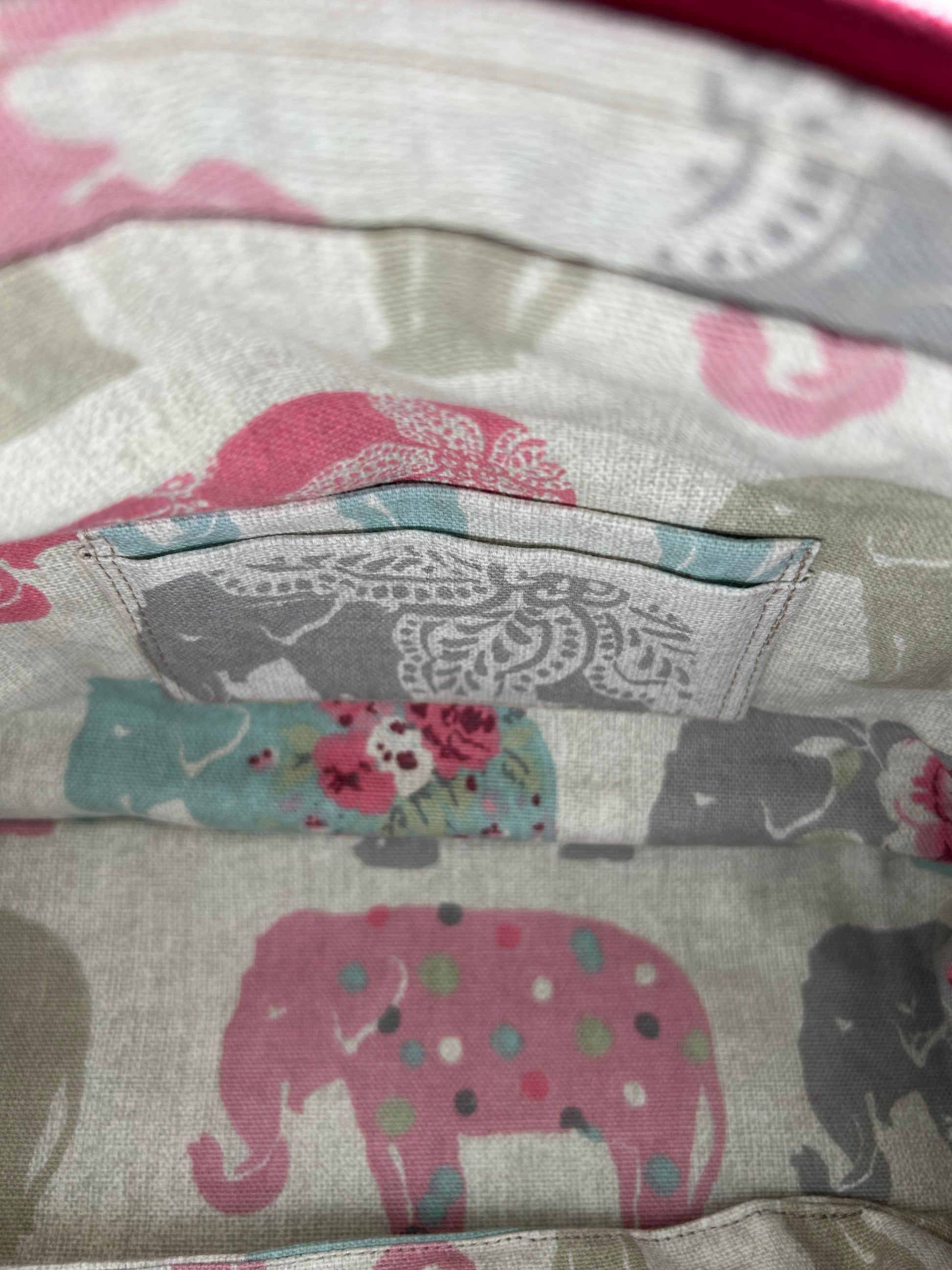 Practical as well as eye-catching, the bag has a zip closure, a beige webbing and burgundy leather strap and on the inside one of my signature fun cotton printed linings.....this time its elephants in subtle cream, soft pink and soft teal. Here you'll find a couple of credit card pouches, plus another small pocket.
