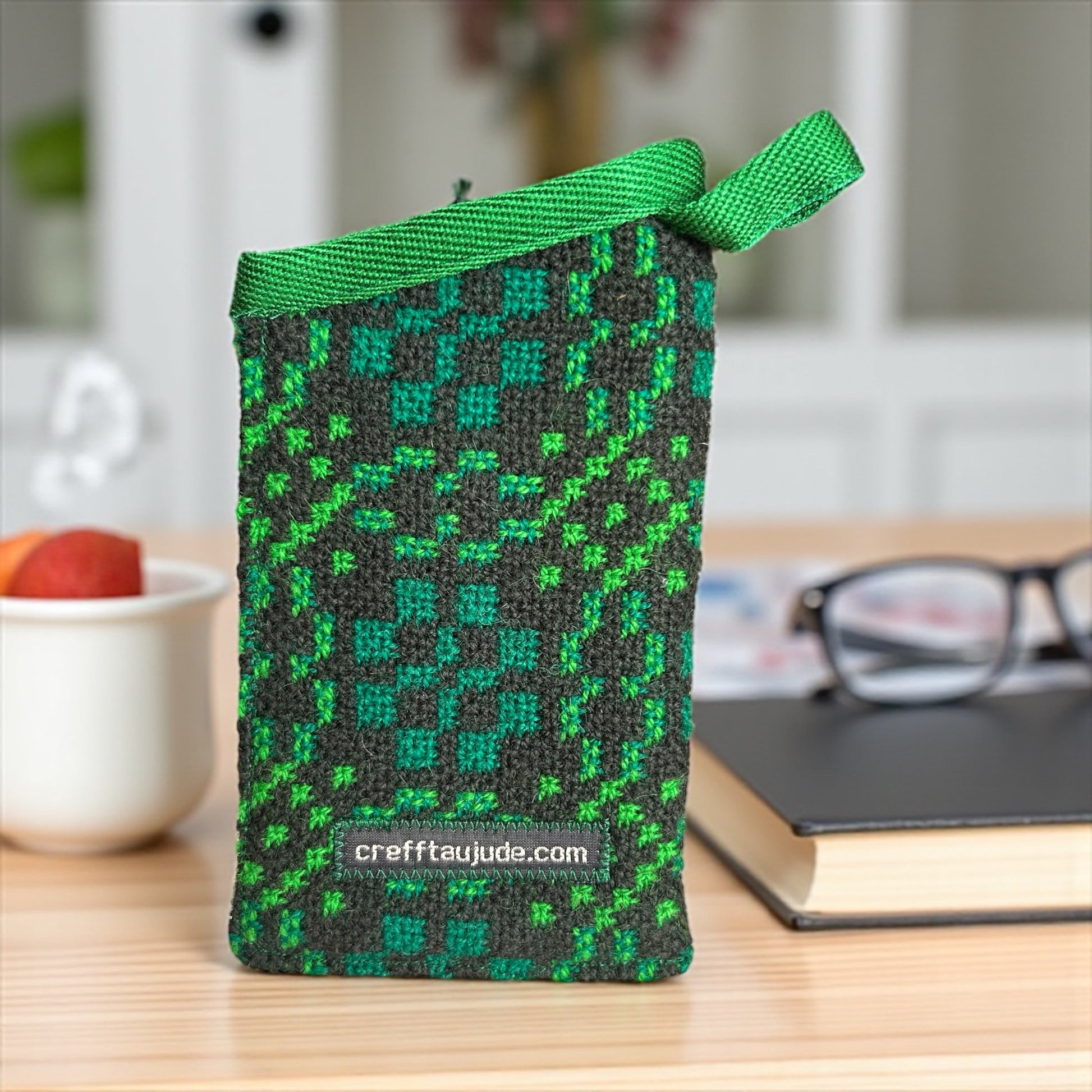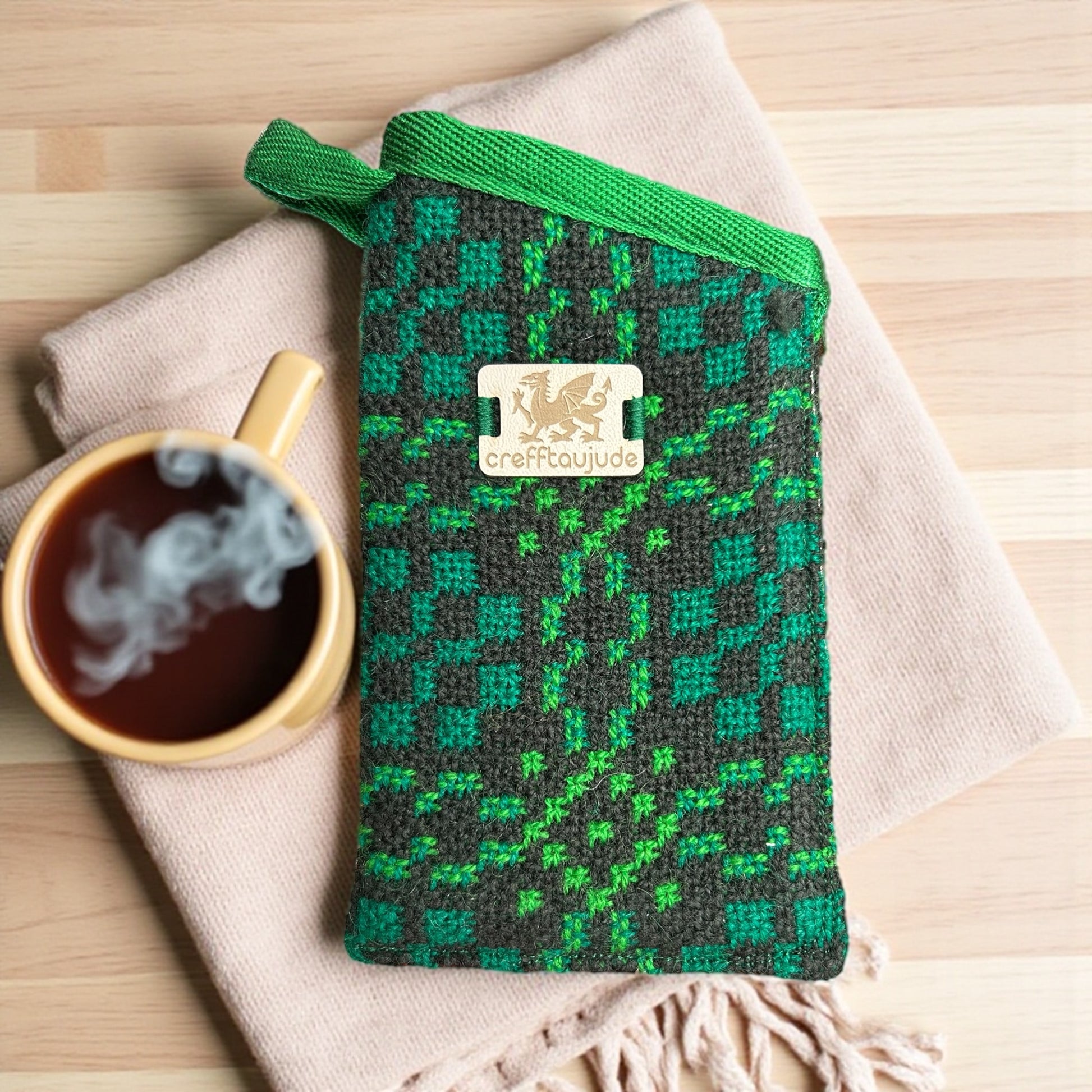 Handcrafted from vintage Welsh tapestry wool in a geometric heritage design , in bright emerald greens and dark chocolate brown