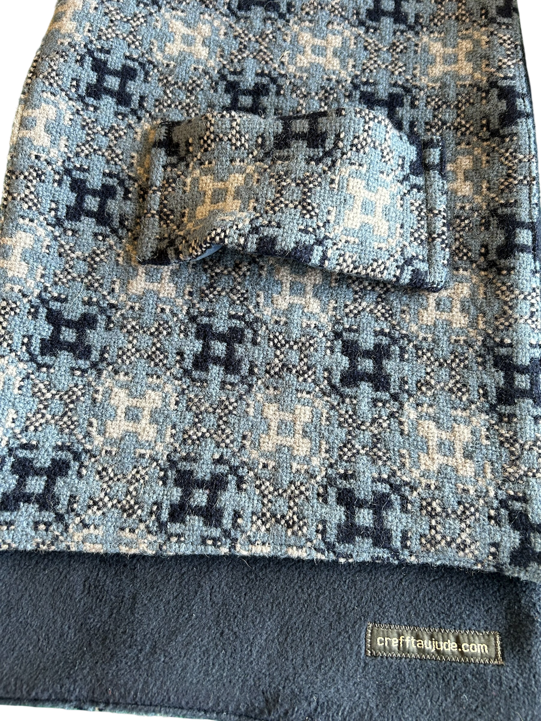 Wrap yourself in warmth and heritage with this beautifully crafted scarf, handmade from vintage Welsh tapestry wool, backed with a soft acrylic fleece. The striking design blends navy, with pale grey and soft airforce blue, with a dark navy fleece.