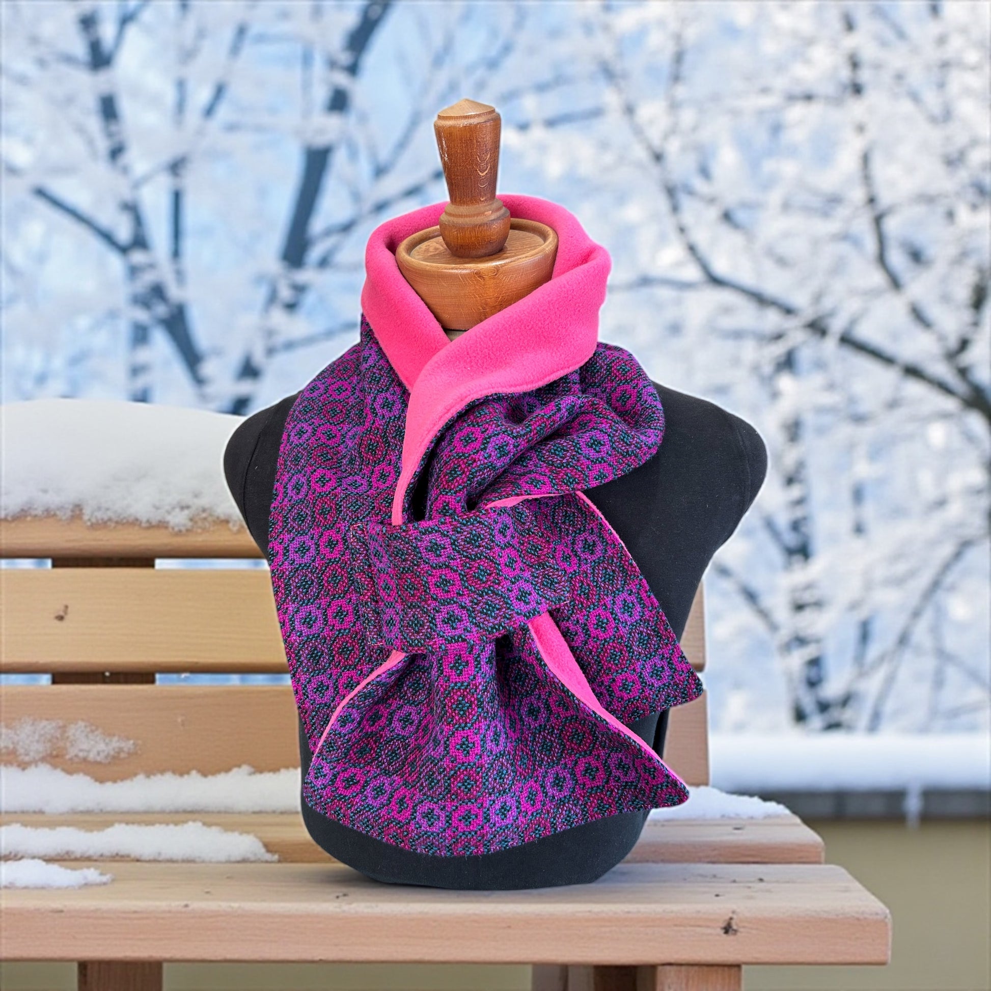 Handmade scarf crafted from vintage Welsh wool tapestry, with a soft acrylic fleece lining to ensure comfort next to the skin. Warm , sustainable and a one-off, in this rich pinks, purples and hint of khaki.