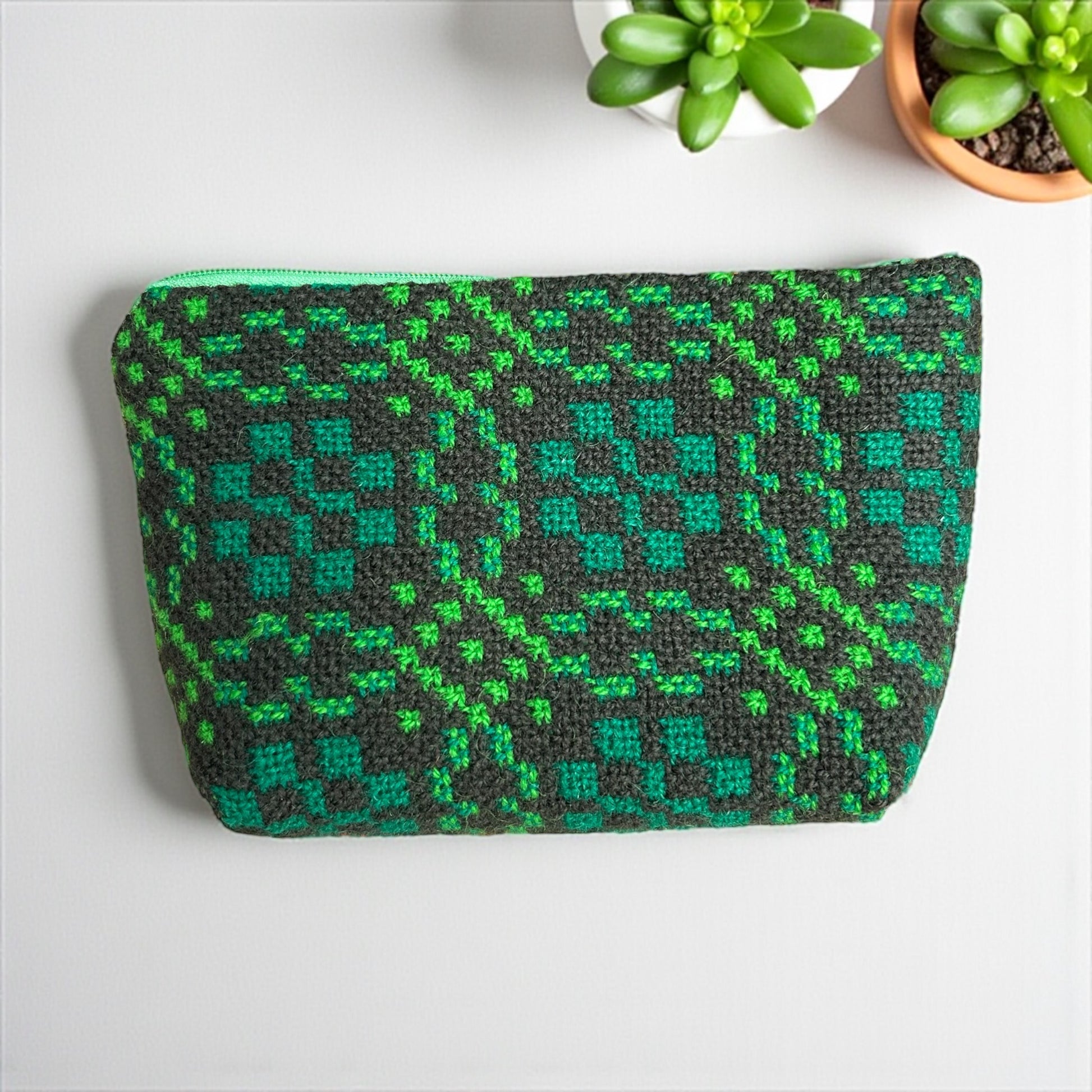 handcrafted make-up bag made from vintage upcycled Welsh wool tapestry in a traditional geometric design . Shades of emerald greens and dark chocolate brown make up this heritage fabric transformed into a useful pouch /purse/cosmetic bag