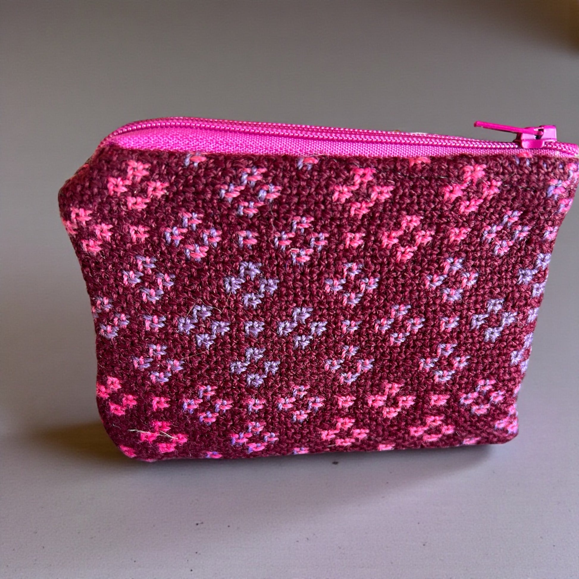 authentic Welsh tapestry purse, made from vintage upcycled clothing in this vibrant rich dark red, pink and lilac, closed with a bright pink zip. A cheeky owl cotton printed lining.