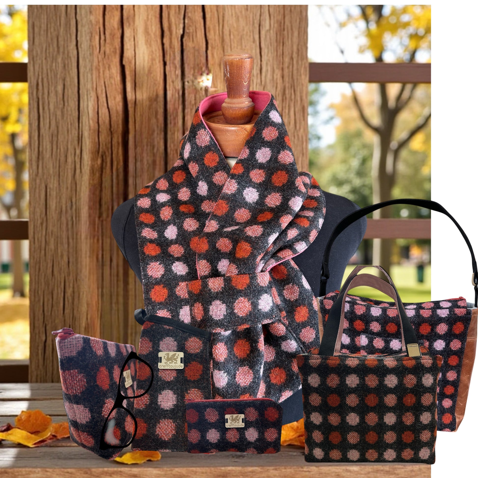 In charcoal grey, with burnt orange and soft pink spots, it makes a stunning statement adding both comfort and character to your outfit.