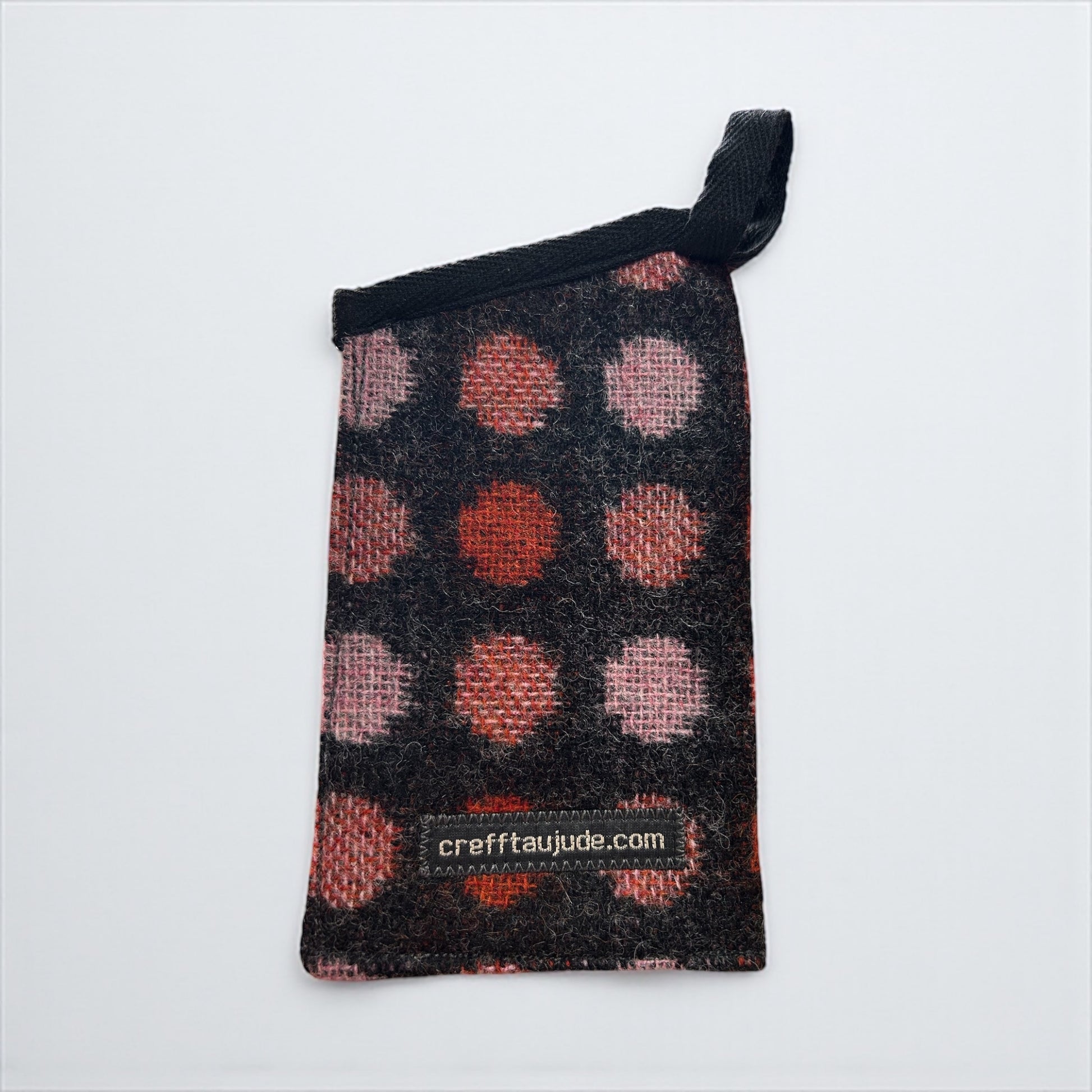 Contemporary wool design fabric in rich charcoal grey background, terracotta and pale pink contrasting circles .