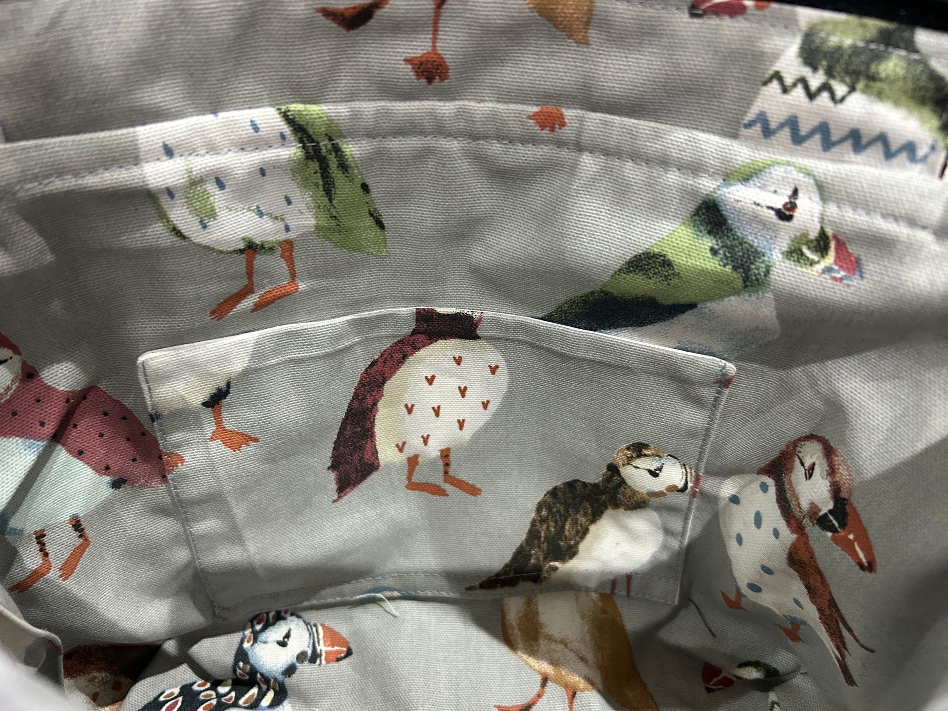 Handcrafted from a contemporary wool fabric in a charcoal grey background with terracotta and pale pink circles, making sure you’ll add a touch of style to your outfit . It has two tone black and pale pink webbing handles , with a printed cotton lining …… oooh did I mention it’s covered with puffins ❤️