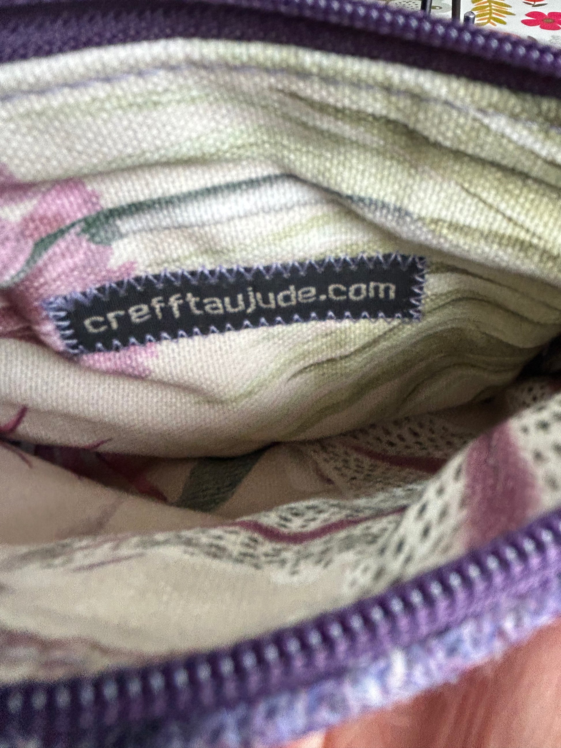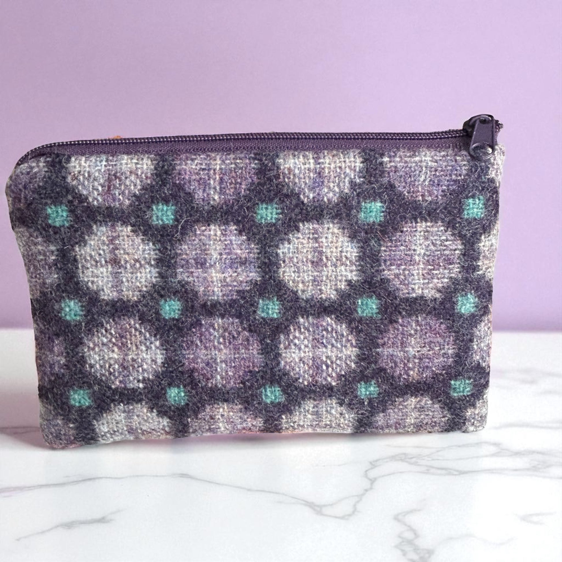 handmade wool purse with a botanical print cotton lining. Colour palette is soft lilac, muted teal and dark purple, giving this contemporary geometric design wool fabric a lushious luxury feel.