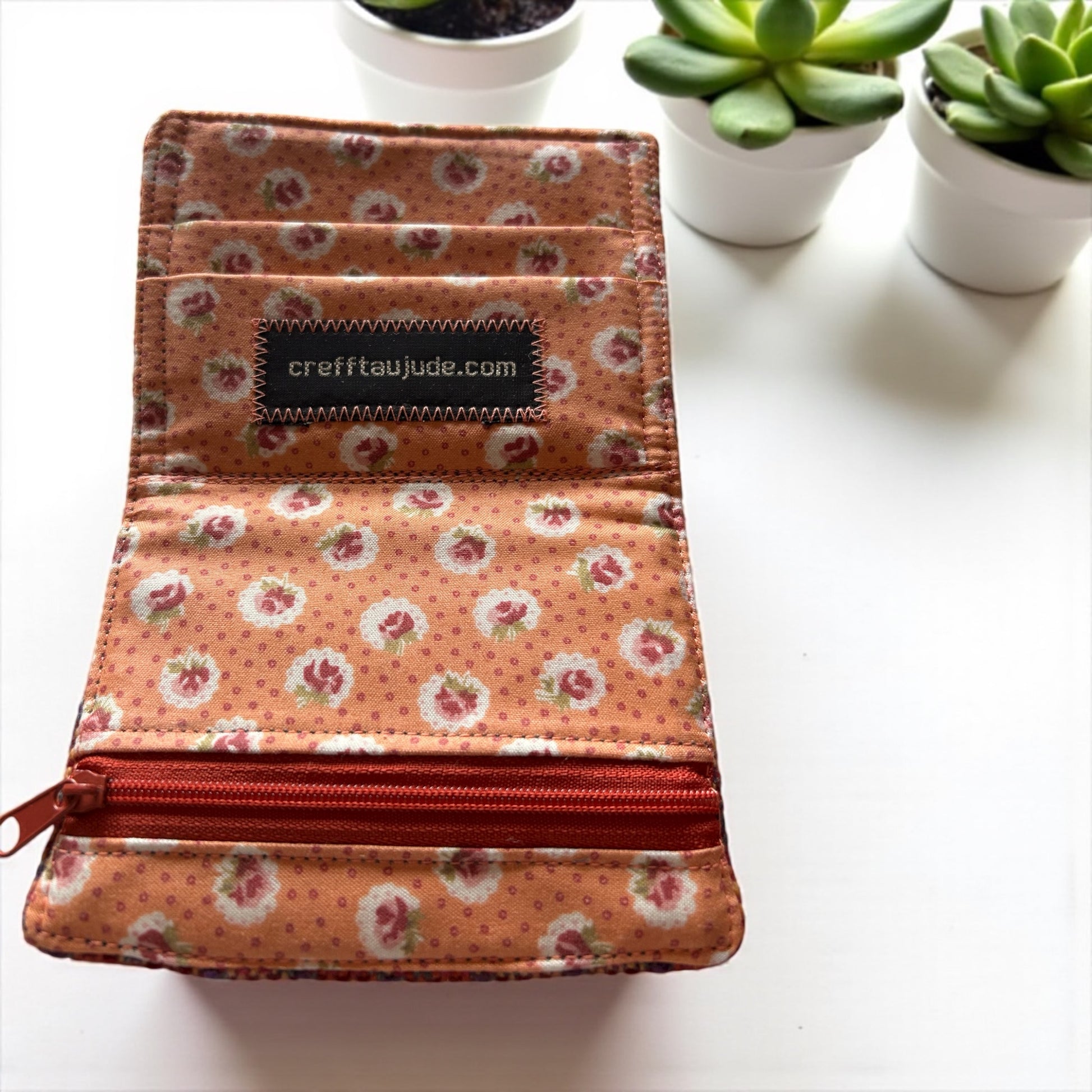 handcrafted purse/wallet made from vintage welsh wool upcycled fabric with a floral cotton printed lining. It features card slots and a zipped coin pocket.